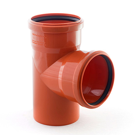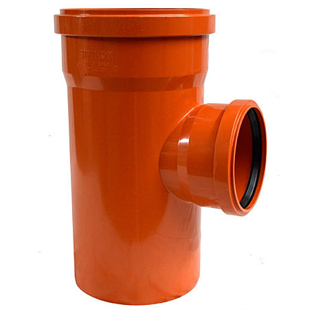 Тройник ПВХ как и трубы, имеет яркий оранжевый цвет, раструбную конструкцию, обеспечивающую надежное соединение труб.